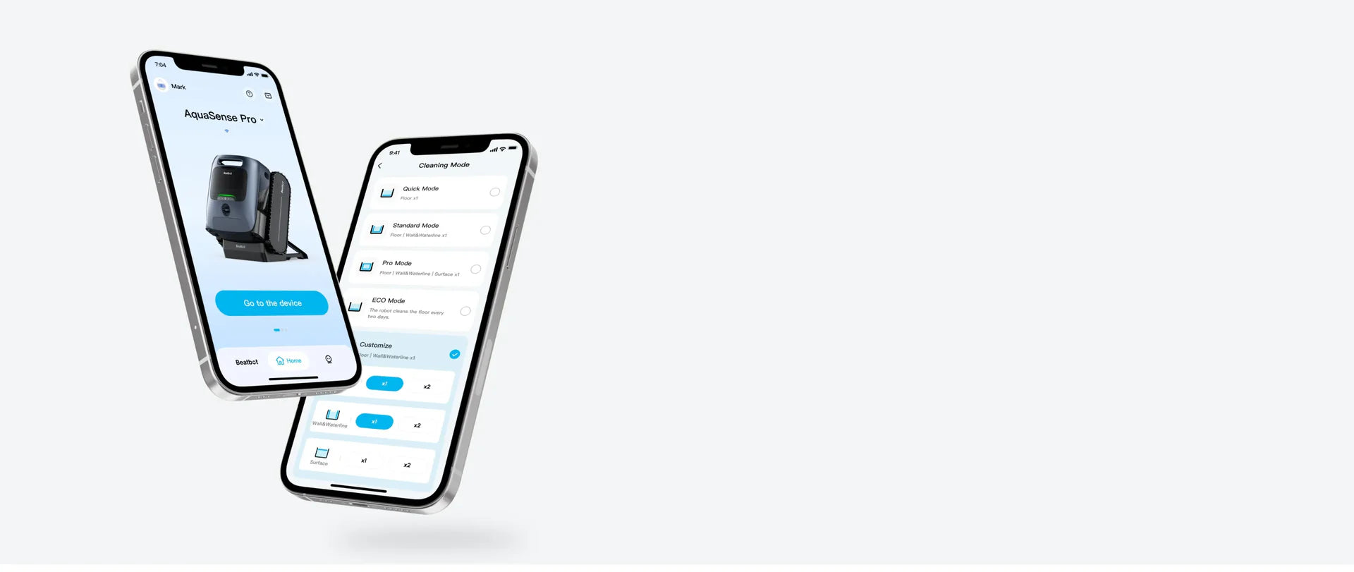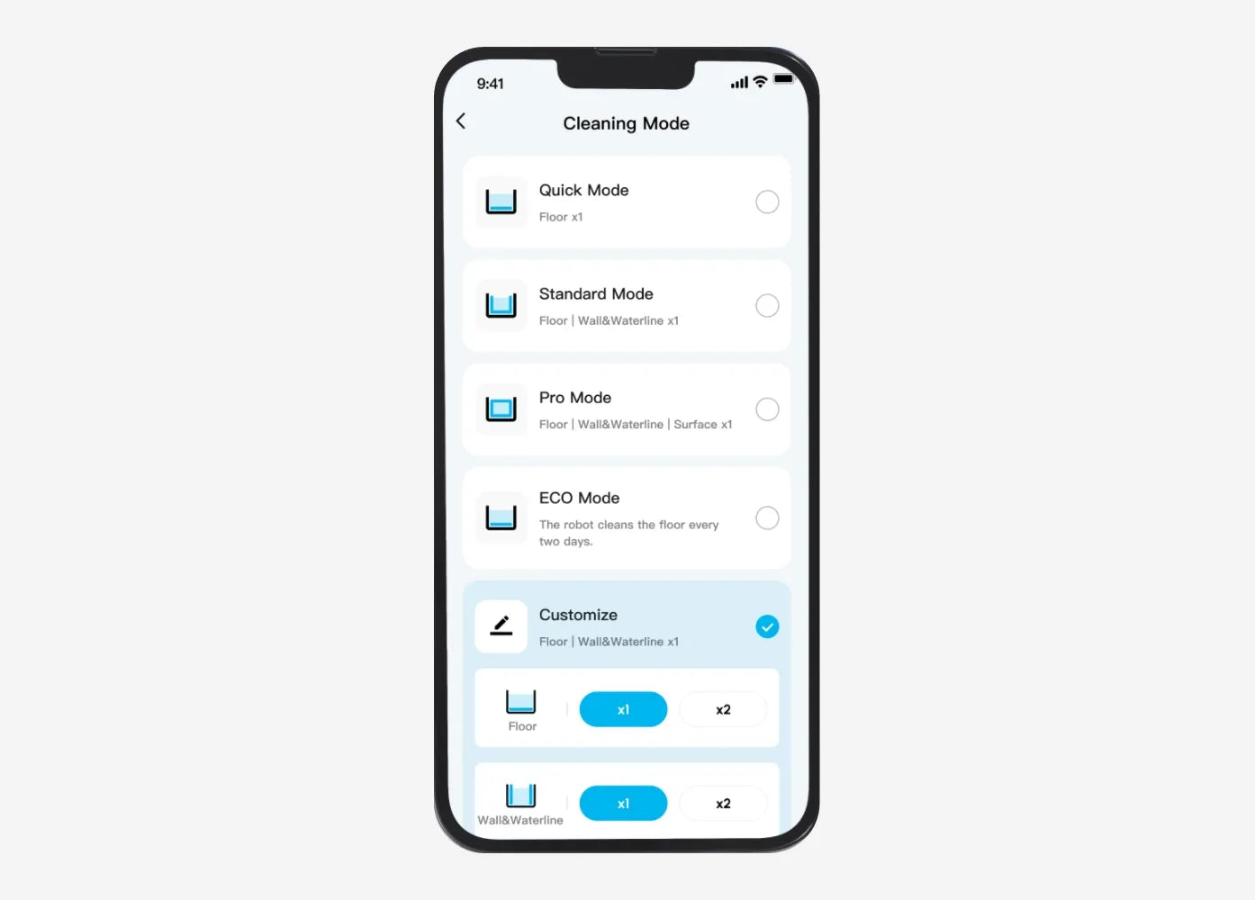 Users can select among the five cleaning modes directly from the App.Quick mode, Standard mode, Pro mode, ECO mode, Custom mode(OTA)